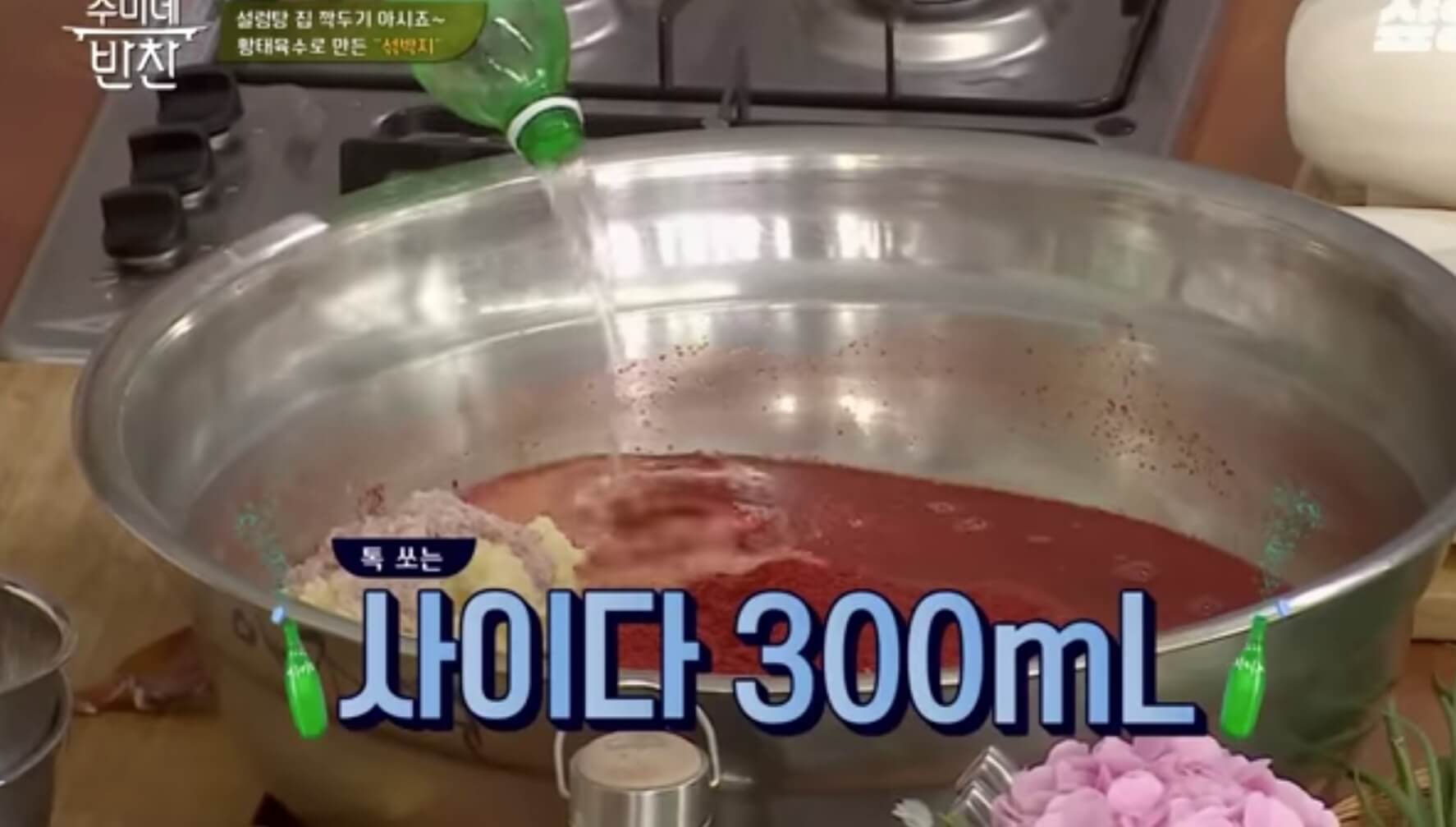 8) 사이다 300ml 넣어주세요. 사이다를 넣으면 섞박지의 청량하고 시원한 맛이 올라갑니다.